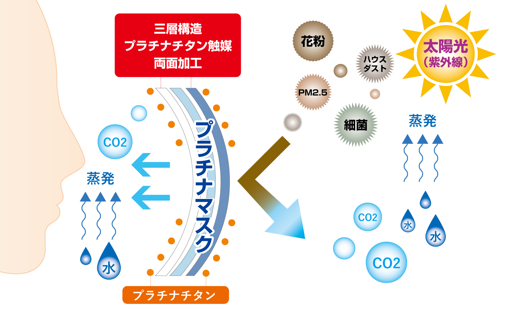 プラチナマスクは、フィルターを通過しようとする菌やウィルスをプラチナ触媒の力で吸着し、二酸化チタン触媒の力で分解して無害化し、マスクの表面に着いた菌やウィルスも分解除去します。 日に当てる事でマスクの内面も浄化されるので、使い捨てずに繰り返し使用する事が可能です。
