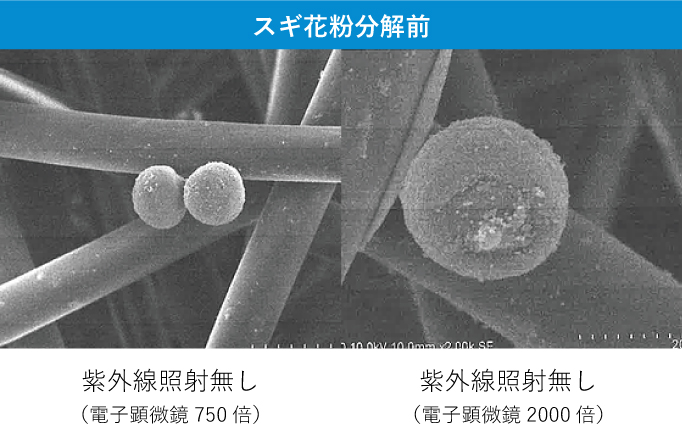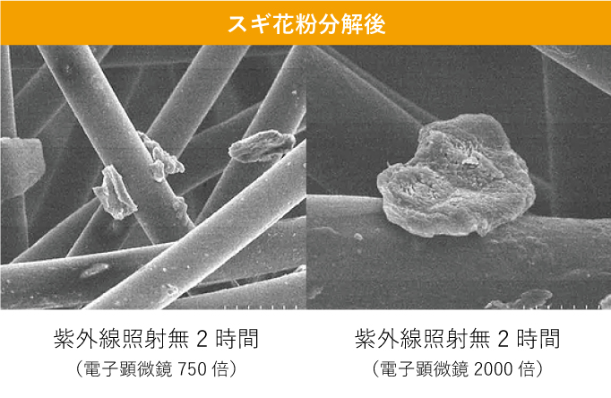 紫外線を照射して2時間後、見事スギ花粉が形状が崩れ分解されている様子が確認されました。