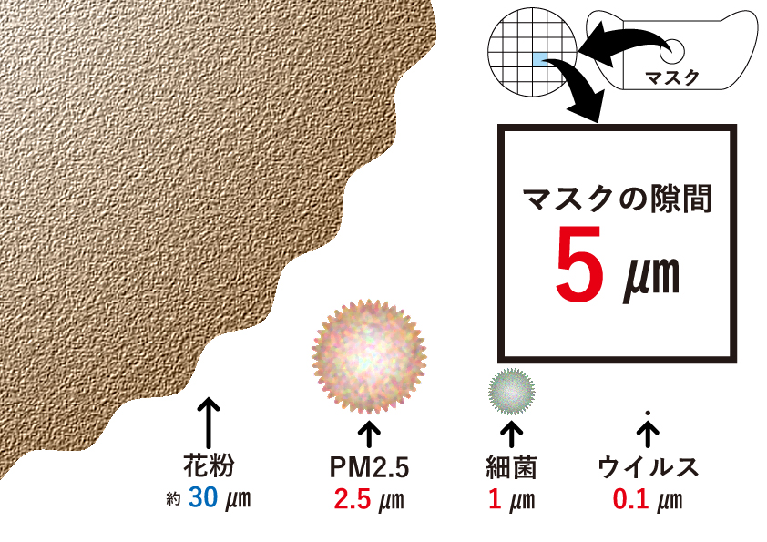 医療用のマスクでも除去出来る粒子の大きさは直径5㎛までで、細菌の大きさは約1㎛、ウィルスは0.02~0.1㎛です。浮遊するウィルスは容易にマスクの網目を通り抜ける事が可能なのです。