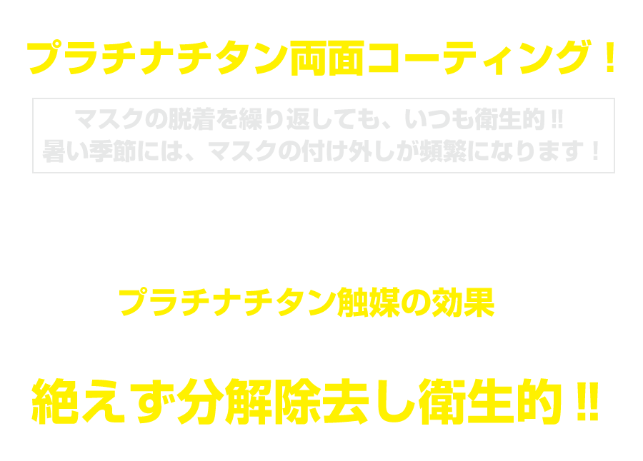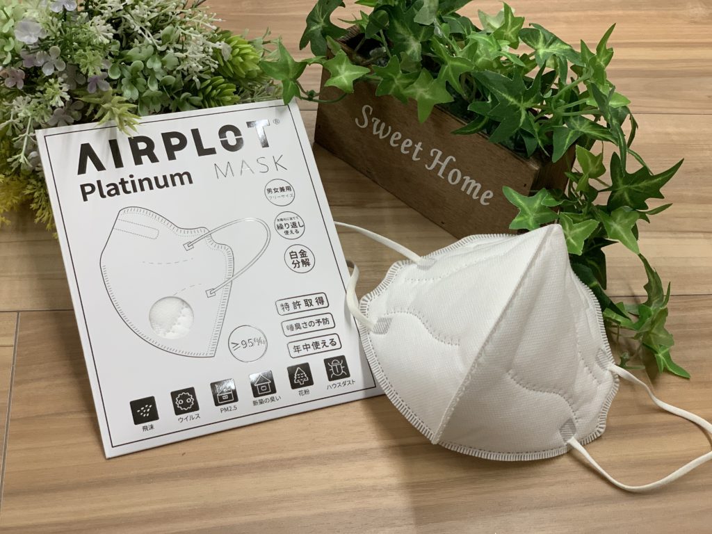 プラチナは、自身は変化せず周りの物質を無害化させる不思議な力があり、そんなプラチナチタン触媒を利用したコーティング剤のことをエアープロットコーティングをしたマスクです。