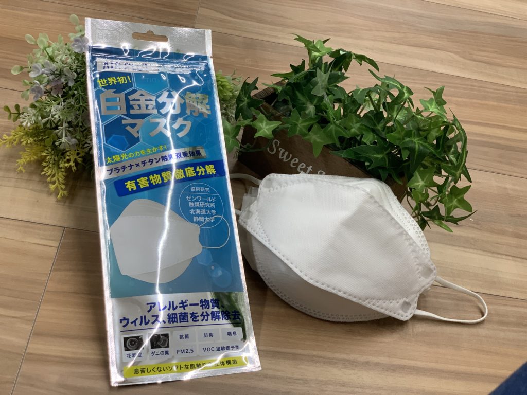 北海道大学及び静岡大学と共同研究開発した「プラチナプラチナチタン触媒」が表面にコーティングされたマスクです。