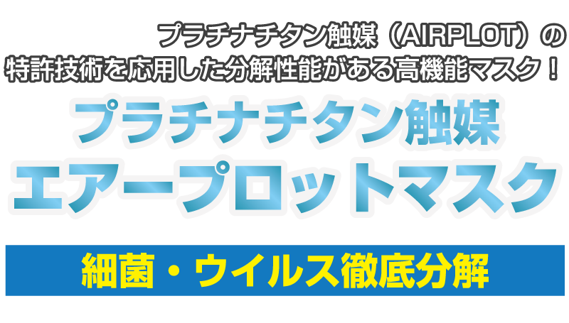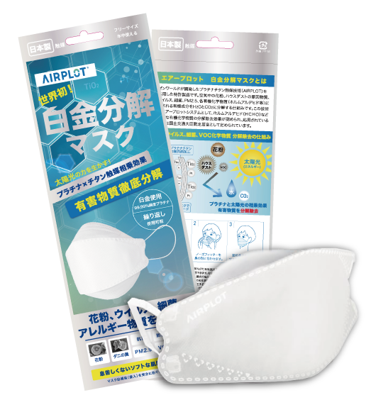 ゼンワールドと北海道大学および静岡大学で共同研究したプラチナチタン触媒(AIRPLOT)の特許技術を応用したウイルスなどの分解性能がある高機能マスクで、プラチナチタン触媒=プラチナ+二酸化チタンで構成されています。